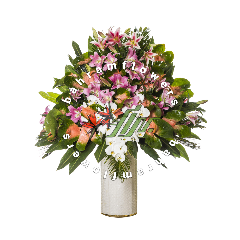 ابعاد: 150 * 100 سانتی متر جنس پایه :چوبی نام گلها : ارکیده -آنتریم-لیلیوم-استلزیا مناسب برای :مراسم شاد به دلیل فصلی بودن گلهای طبیعی ، جایگزین گلهای ناموجود با توجه به حفظ تم رنگی انتخاب میشوند.
