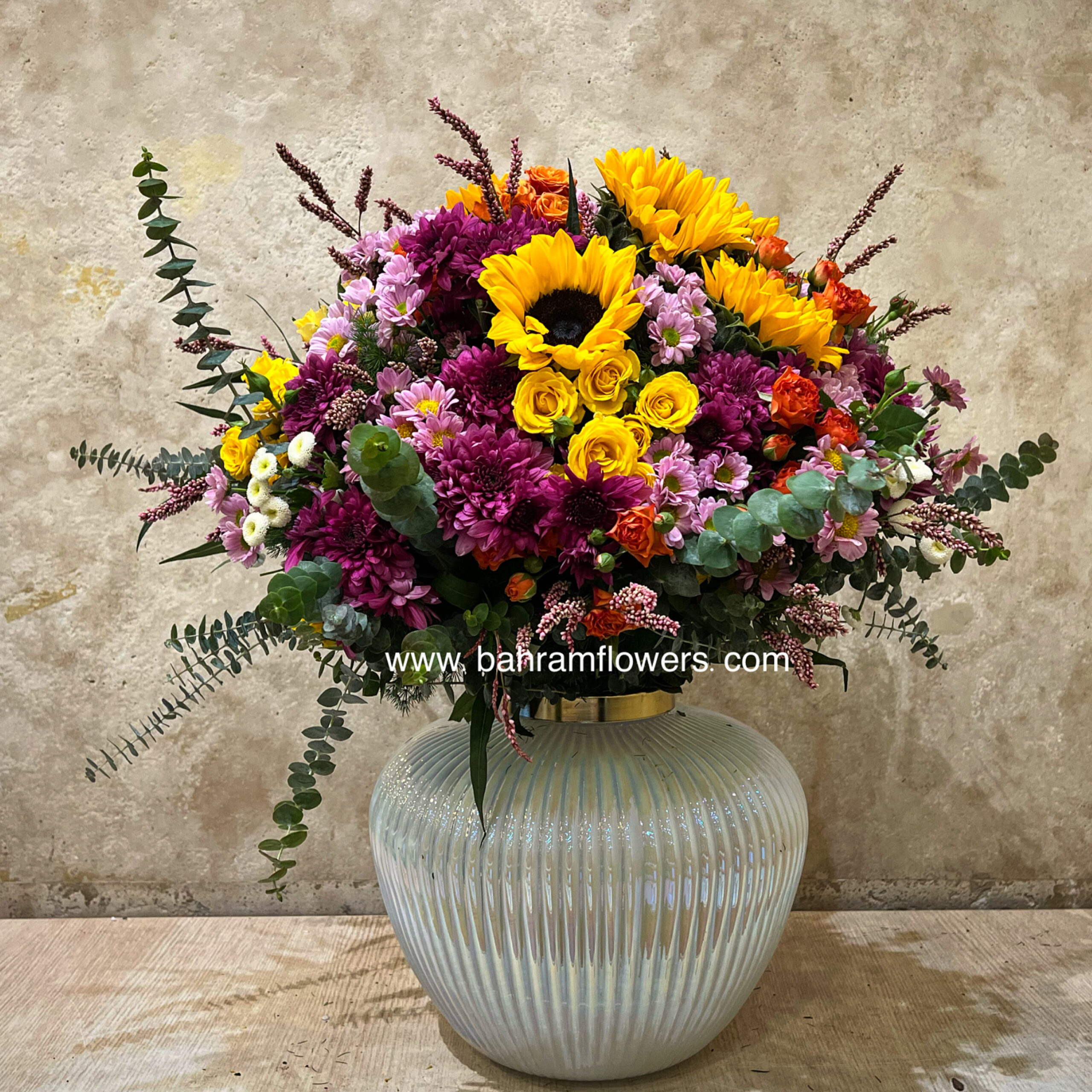 گلدان شیشه ای با گل های رنگی